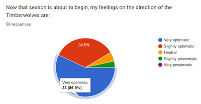 Over 90% of participants enter the season feeling optimistic. That’s a bump up from the 87% a season ago and to be expected considering the Wolves are coming off a Western Conference Finals appearance.