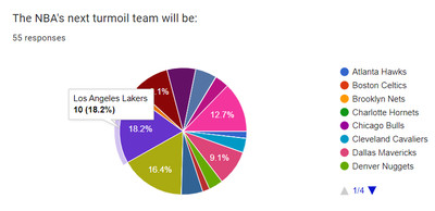 How do you think a team that was basically swept in the first round of the playoffs, have no real young talent, hired a first-time head coach with on professional experience, and drafted the best player’s son will do? I take a ton of delight in this response, although I do fear LeBron James retiring and followed by the folding of the NBA. The only other teams with 10% of more of the vote are the fellow first round sweepee Suns, and the Kawhi-strung Los Angeles Clippers.