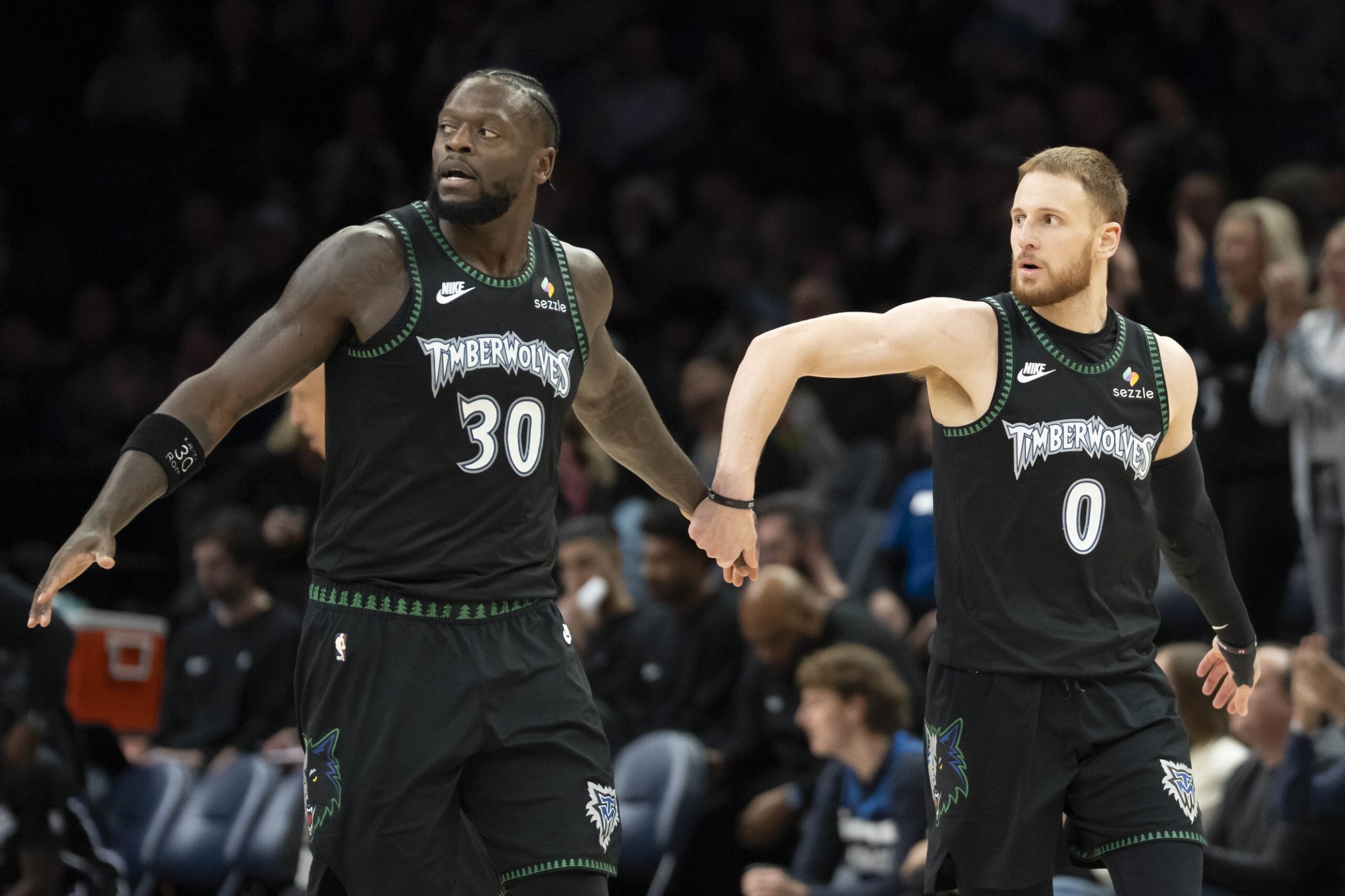 Dec 14, 2025; Minneapolis, Minnesota, USA; Minnesota Timberwolves forward Julius Randle (30) and guard Donte Divincenzo (0) shake hands after a basket against the Sacramento Kings at Target Center. Mandatory Credit: Jesse Johnson-Imagn Images