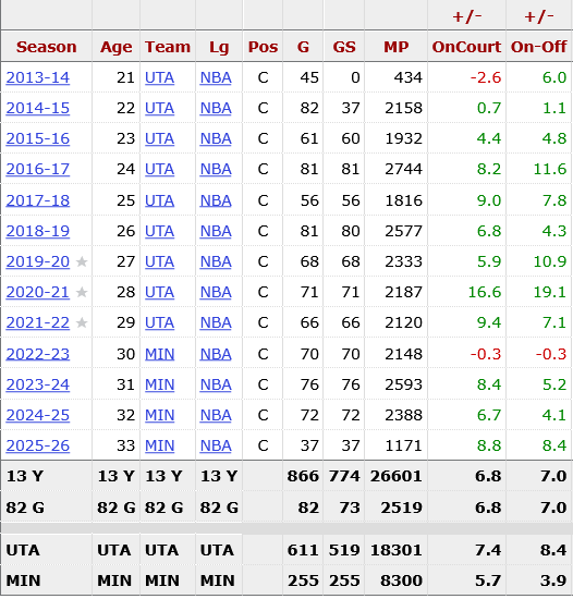 According to Basketball Reference, this season the Timberwolves are winning by 8.8 points per 100 possessions with Gobert on the court, and there is an 8.4-point difference when he is on the court compared to when he is off it. However, it is purely based on the difference in defensive rating (DRTG).