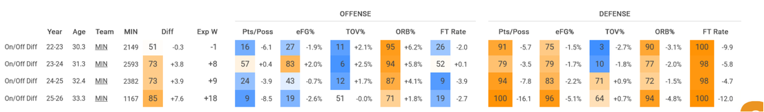 According to Cleaning the Glass, Gobert holds an ON/OFF differential of 7.6 points per 100 possessions. The Timberwolves have a better offense when Gobert is off the floor, scoring 8.5 points per 100 possessions more than when he is on the court, which ranks Gobert in the 9th percentile.