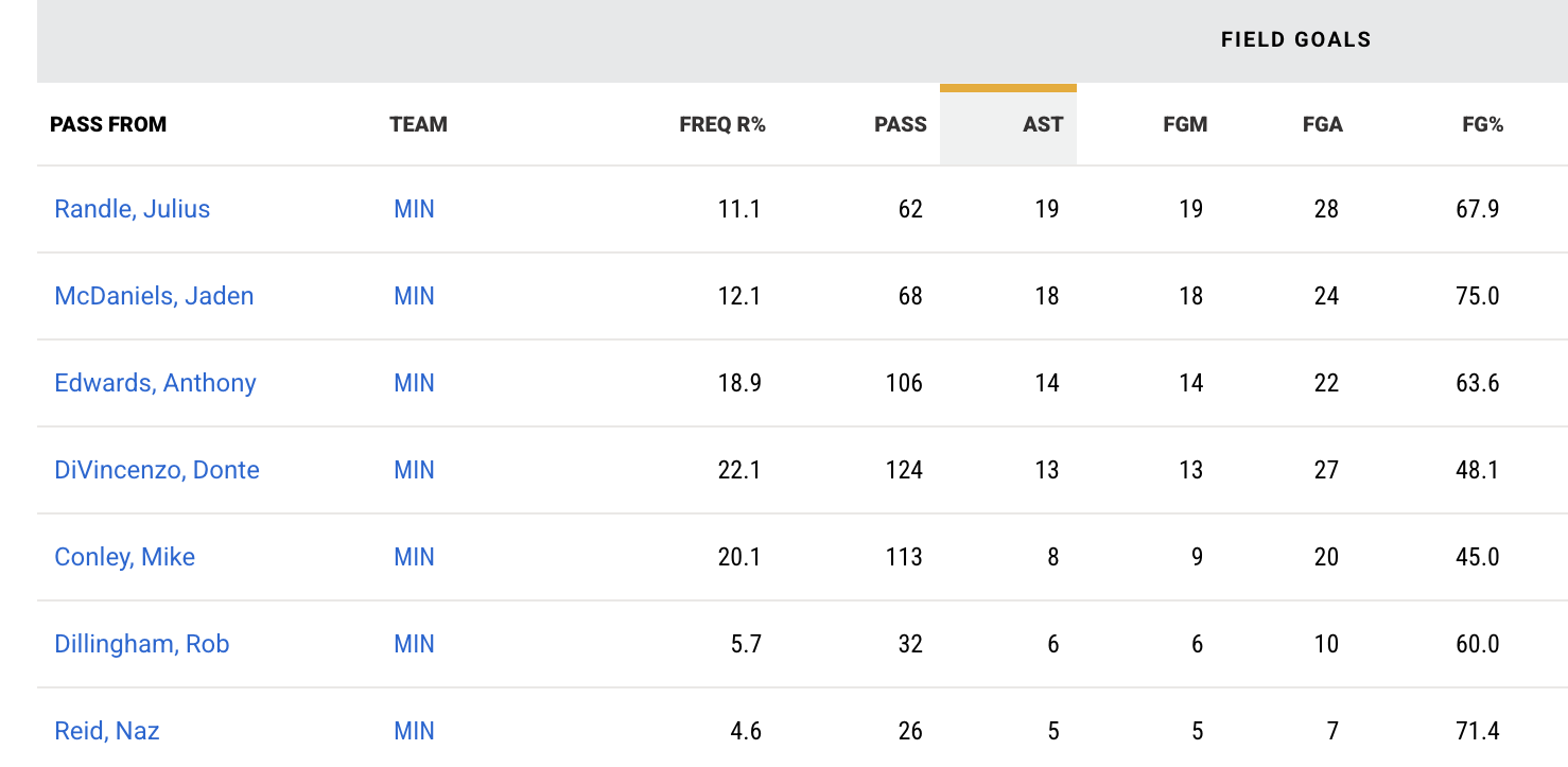 Against the Warriors, McDaniels assisted to Gobert four times, Terrence Shannon Jr. assisted to him twice, and Randle, Naz Reid, and Donte DiVincenzo all assisted to Gobert once.