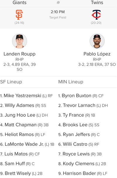 Today, the Twins look to make all their mommas proud as try to sweep the weekend series with the San Francisco Giants behind this compilation of competitors…