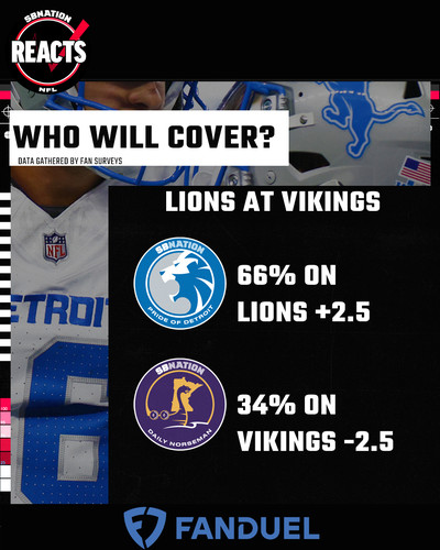 Lastly, we have this little tidbit from our friends at FanDuel. As we know, the Vikings are hosting a big game tomorrow against their division rivals from Detroit, and the majority of the money for this one is not going towards the purple cause.